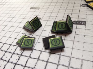 Porównanie starych dwustronnych żetonów, drukowanych na tekturze i nowych, jednostronnych, drukowanych na piance